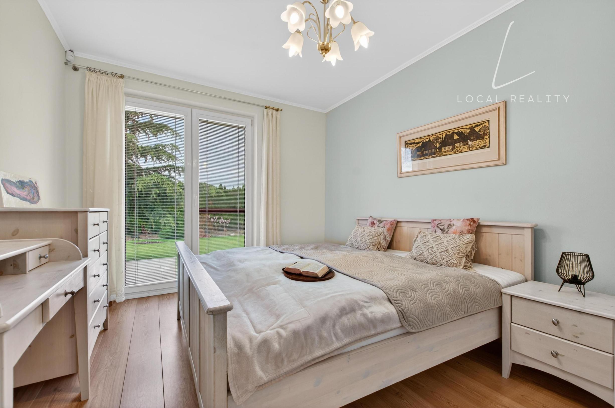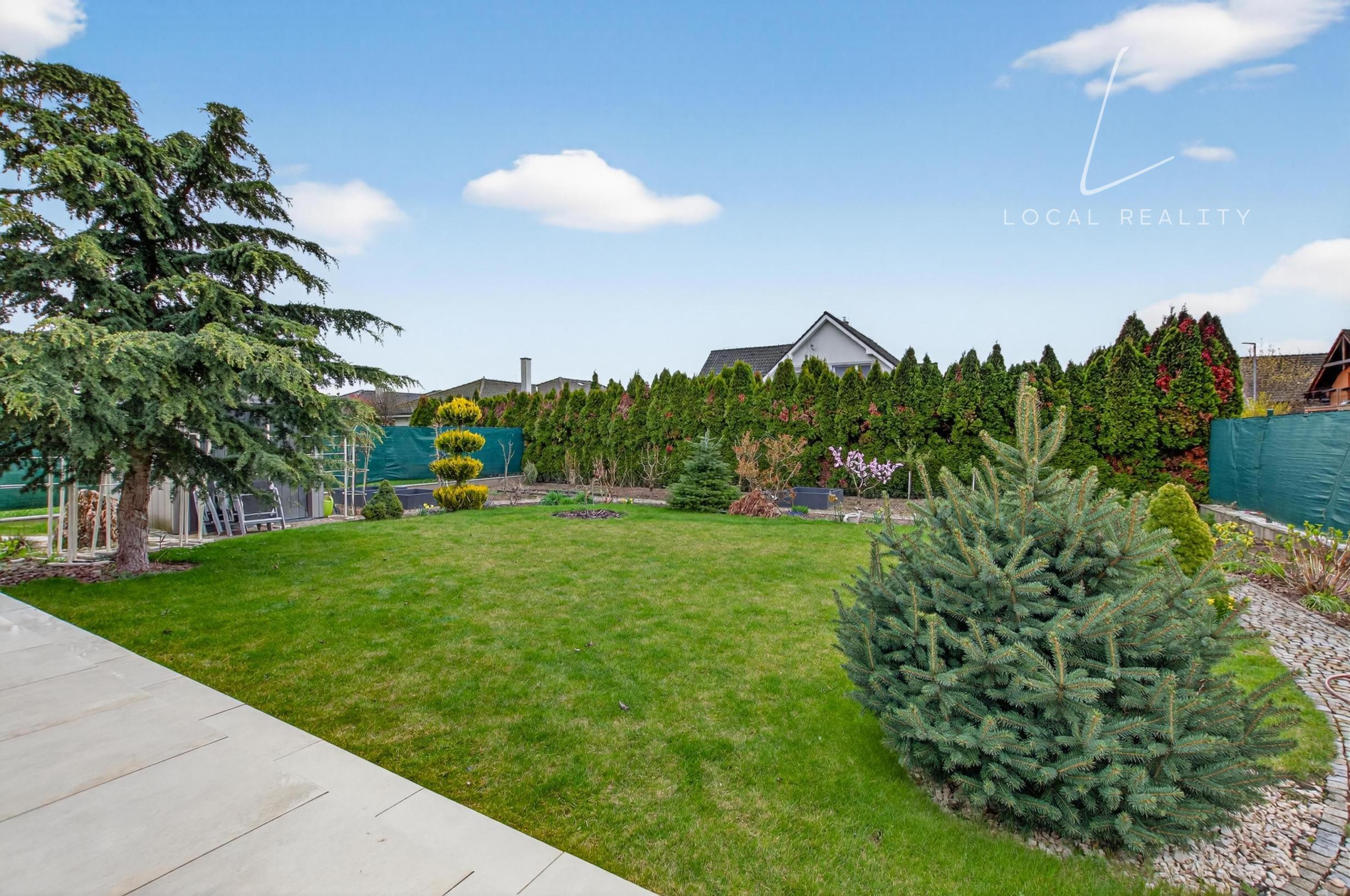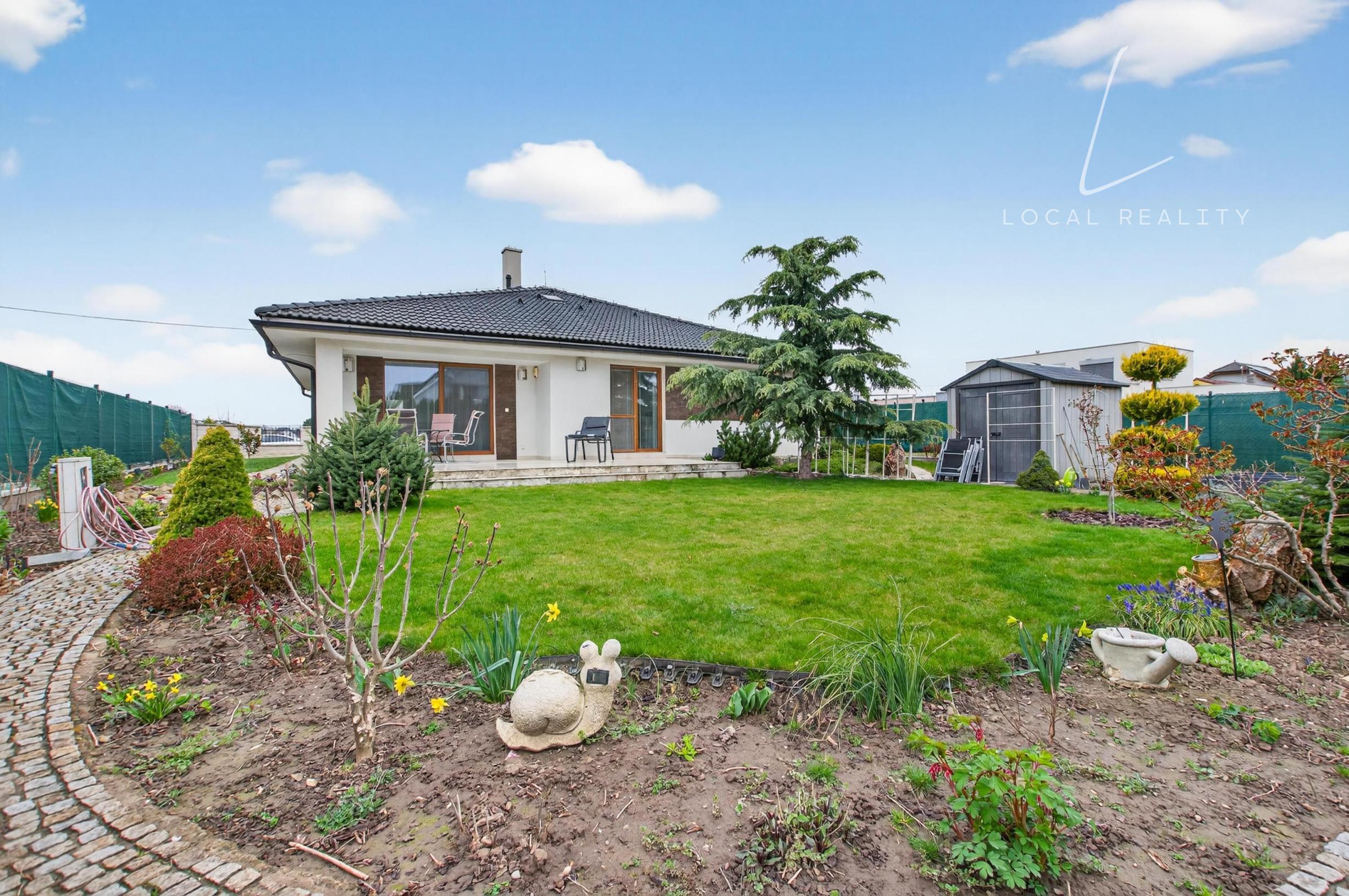 Dom je udržiavaný, záhrada s okrasnými rastlinami, prestrešeným sedením navádza pocit dovolenky.