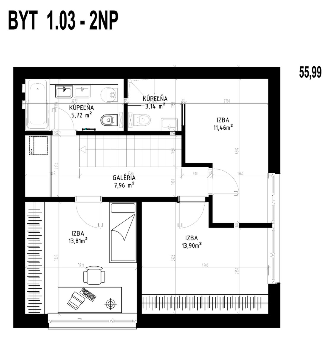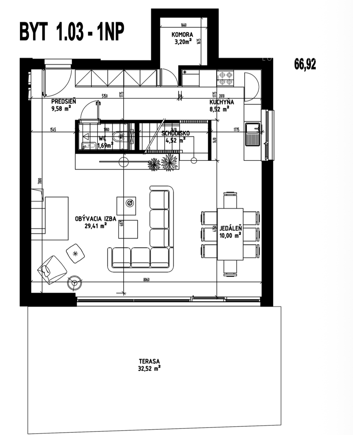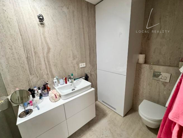 Dispozícia bytu zahŕňa svetlú obývaciu izbu s priamym vstupom na terasu, kuchyňu na mieru so vstavanými spotrebičmi vyššieho štandardu, 4 obytné miestnosti, 2 kúpeľne a samostatné WC.