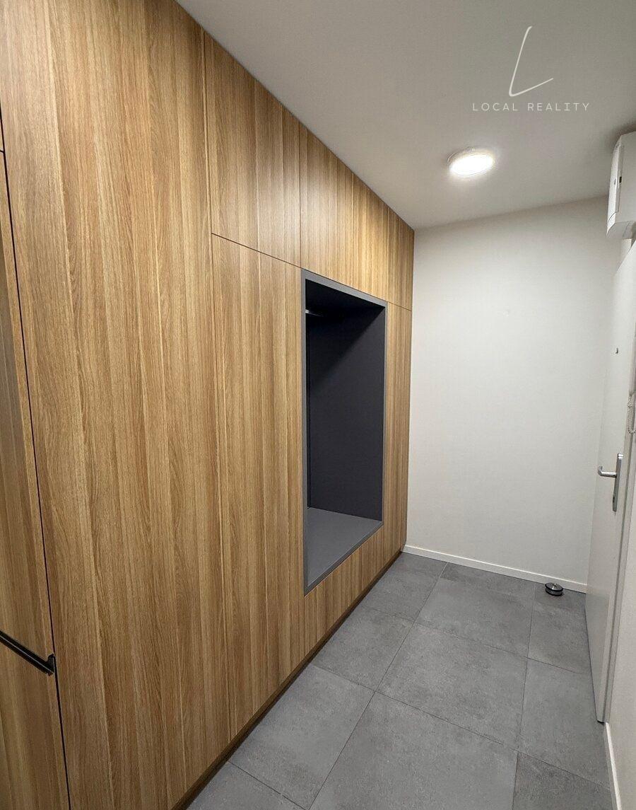 Byt je zariadený nábytkom vyrobeným na mieru s dostatkom úložného priestoru.